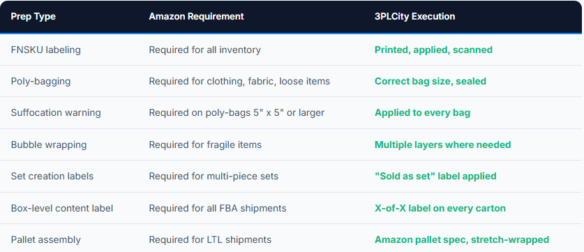 3PLCity follows Amazon's Prep Requirements Guide exactly. Our staff are trained on every prep category - poly-bagging, FNSKU labeling, bubble wrapping, set creation, fragile items, and hazmat documentation. We verify compliance before shipping to the FC.