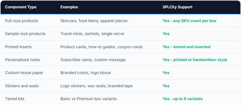 This requires: pre-assembly planning, component inventory management across multiple SKUs per box, subscriber variant handling, personalization data processing, scheduled ship windows, and scan-verified kit completion reporting. Most standard 3PLs are not equipped for this workflow. 3PLCity is.